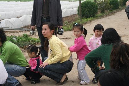 3月8日,下起了雨,宸妈说好了要带我们去溧水采草莓的,几个妈妈都非常惴惴,心想明天如果还要下雨的话,这个烂泥糊糊的农村大棚可怎么进去哦。天公作美,知道我们活动定在9号,早上睁开眼睛,已经是阳光灿烂了!好哦!大越越和我们一起去,早早起身,丫头也兴奋的很,刷牙、洗脸、吃饭、换衣服一气呵成,高高兴兴下楼去!大越越很快也来了,常Sir到底是警察,很快就进入角色,协助陈老师把这么些车车,这么些家长落实到位!还是没有照相机,还是用的越妈、多妈、涵妈的成果!