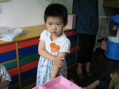 虽然前晚睡得也晚,但是听见大人在忙着准备被褥,收拾东西,娃娃也睁眼了。没有哭,也没有情绪,不错。吃完早饭,拉着爸爸妈妈的手,就下楼了。一进教室,老师们就迎接过来,让悦悦去玩玩具,熟悉环境。带着悦看了洗手池,看了厕所,看了喝水的地方,认真告诉她每个地方要注意什么。因为开放日,40个娃娃外加他们的爸爸妈妈、爷爷奶奶,觉得教室里黑压压的全是人。王老师拿出一盒子切切乐的玩具,拿给悦悦玩,很漂亮,丫头和阳阳一起玩起来。过了会儿,崔老师让小朋友们排排坐坐好,要带着她们玩“母鸡下蛋”的魔术,丫头紧紧拉着我的手,让我陪着她,我就虔诚地蹲在丫头身后。(其实,很多时候,看见我和她爸在身边,丫头都很嗲的,就会表现出无比的依恋)