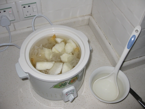 明天周末了,得给悦的早饭换点内容了,已经煮了一个礼拜的白米稀饭了,眼见这秋天来了,天气燥了,弄点银耳、雪梨、冰糖炖一下,一来润肺,二来悦对银耳非常喜欢,每次一吃就要唠叨两句,“吾贝儿就经常吃银耳羹的!悦最喜欢吃银耳了!”回家以后,三下五除二,找出银耳、冰糖、梨子,放进懒人锅炖起来,幻想着明儿香气四溢、糯软香滑的雪梨银耳羹端到悦和悦爸的跟前,他们对我的敬仰和爱戴啊。。。