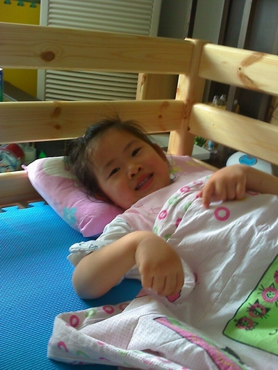 周六一大早,阳妈来电,床已经到达她家了!兴奋之情溢于言表。那很快就该到咱家了!丫头高兴得一蹦三尺高。从来没有这么快起床、刷牙、洗脸的速度的!“叮~咚”门铃响,床儿到我家。三个师傅用悦的话来说,就是“叔叔在搭积木”似的,很快就搞定了!还没垫子呢,丫头就把她的EVA游戏垫摆上去,在她的新天地里蹦床了!师傅要往嘉嘉家进发了,但是不认识南京的路,悦悦爸爸就带路去了!很快,嘉嘉妈来电,说家里的床也弄好了!三个孩子都异常兴奋,可以理解,可以理解哦,自己的小床啊!突然想到,这些个团长们辛苦的为大家联系、落实,日后每当看到我们大家一起团来的,大到一张床,小到一个姓名布条,都会想到我们曾经这样快乐地一起过!多好啊!
